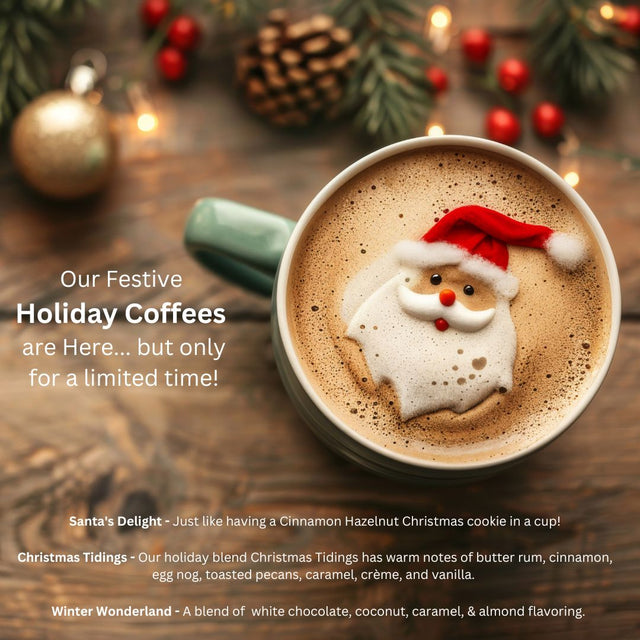 Christmas Tidings - Our holiday blend Christmas Tidings has warm notes of butter rum, cinnamon, egg nog, toasted pecans, caramel, crème, and vanilla.